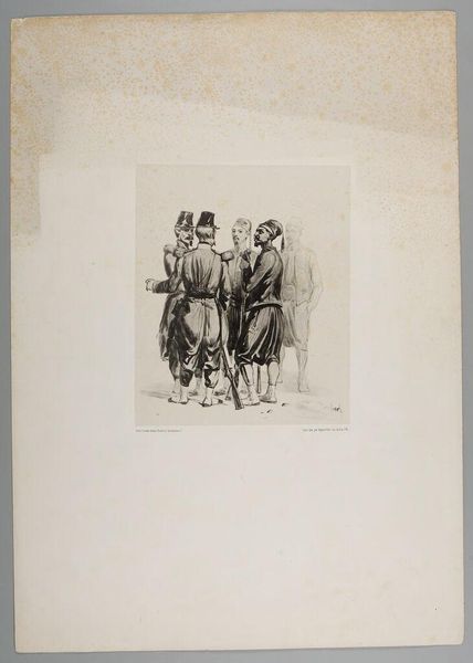 Editor: Victor Adam’s “Asia” depicts a scene of figures on horseback, seemingly from another time. It’s interesting how the artist chose to portray this scene. What do you see in this piece? Curator: I’m immediately drawn to the production of this print. Consider the labor involved in its creation, the artist, the printer, and the distributors. And let's reflect on the very materiality of the print itself, paper and ink, both with their own histories. What social context allowed for this object to even exist? Editor: That's fascinating, considering how different the production of art is today. Curator: Precisely! It highlights the changing relationship between art, labor, and consumption.