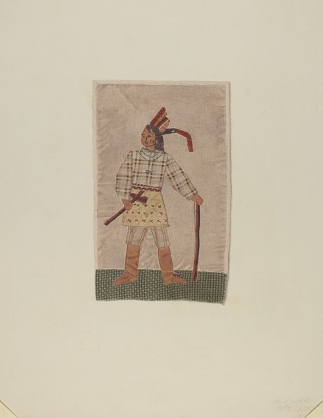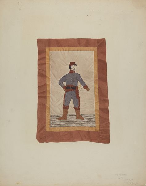 This curious object is called Pillow Top Insert, by Henry Murphy. We don't know exactly when it was made, or where. It's made of fabric, stitched together to form a little scene. The color palette is muted, almost faded, but there's a vibrancy in the way the materials are combined. The texture of the fabrics creates a tactile experience, like running your fingers over the surface. Look at the figure's patterned pants. Those small shapes feel so immediate, so alive. It makes you think about the artist's hands, carefully choosing and placing each piece of fabric. The brown border around the central image really frames the figure, drawing your eye to the intimate world inside. I'm reminded of the work of the Gee's Bend quilters, women using found materials to create powerful and personal narratives through abstraction. Pillow Top Insert isn’t just a picture; it's a process, a journey, a story told in color and texture.