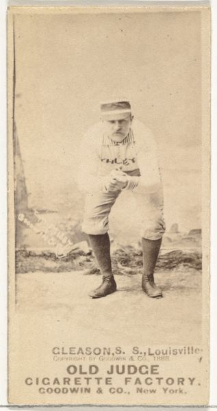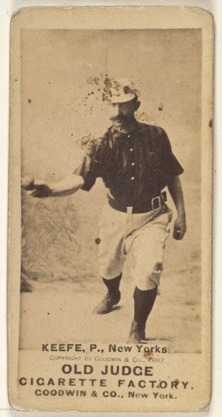 This is "Gil Hatfield, 3rd Base, New York," a photograph made in 1888 by Goodwin & Company for Old Judge Cigarettes. The card depicts Hatfield in his New York team uniform, posed mid-play. These cards, inserted into cigarette packs, were a clever marketing tactic, capitalizing on baseball's rising popularity in late 19th-century America. But they also reflect how institutions, like tobacco companies, began shaping and commodifying popular culture. Baseball, a sport associated with American values of hard work and fair play, was here linked to a habit with known health risks. The image itself is carefully constructed, idealizing Hatfield as a heroic figure. Understanding the context of this card requires research into baseball's early history, the advertising strategies of the time, and the social attitudes towards tobacco consumption. It reminds us that even seemingly simple images are embedded in complex economic and cultural networks.