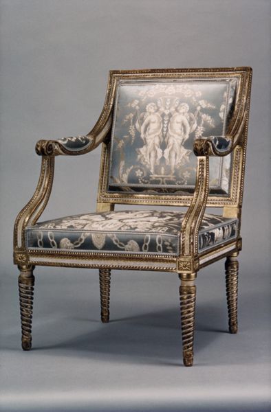 Curator: Here we have an armchair, crafted between 1765 and 1785 by Georges Jacob, and held here at the Metropolitan Museum of Art. Editor: The first word that comes to mind is opulent. The gilding on the carved wood, paired with the elaborate upholstery… It speaks volumes about the priorities of the owner. Curator: Indeed. This piece speaks to the Rococo style that flourished during that era. Considering the society of the time, this chair was definitely commissioned for someone of significant means, embedding it in the narratives of wealth and power structures. The question becomes, who were these people? What roles did women play in commissioning or even using such decorative pieces? Editor: The Rococo style prioritized ornamentation. Look at the legs, the back, the seat – every surface elaborately worked. I wonder how many hands were involved in the production? Were they specialist woodcarvers, or were they more generalized labourers who contributed at various points? And how does that division of labour relate to the quality and design of the finished piece? Curator: Exactly! Thinking about the imagery woven into the fabric – those neoclassical figures around the urn, the garlands. There's a specific message being conveyed, not just about wealth, but also about education and refined taste. These chairs weren't just objects of utility, they were tools for signaling status, power, and intellectual prowess within a very specific social circle. Editor: The choice of materials themselves says so much: the quality of the wood, the presumed fineness of the original fabric – these indicate access to networks of trade, both local and international. The very possibility of a comfortable posture becomes a class marker. How long did the entire production take from sourcing wood to installation in a residence? Curator: It really prompts us to think about the interconnectedness of material culture, class, and the shaping of gender roles. By examining the artwork through this lens, we gain deeper insight into the period. Editor: Indeed, it serves as a vivid example of the artistic labor of the era, revealing power, skill, and artistry.