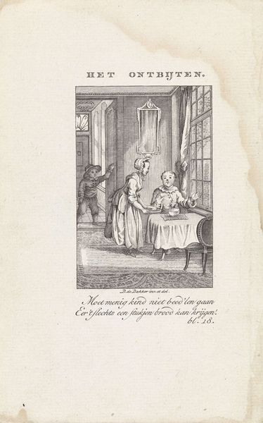 Editor: This is "Titelblad voor: De Gardes d'Honneur in vier zangen," created between 1813 and 1815 by Reinier Vinkeles. It's an engraving, a print, held at the Rijksmuseum. I’m struck by its stillness – it's almost like a captured moment in a play. What do you see in this piece that brings it to life? Curator: Life, exactly! I imagine it’s like peeking through a keyhole into a tense, albeit terribly polite, conversation. It’s neoclassical, certainly, but softened. Vinkeles plays with the rigid lines expected of the era by setting it within a common scene, a gathering of men in domestic confines. But don't you think the real beauty lies in the suggestion of the narrative – what do you imagine is being discussed? A matter of honor? A political squabble? Editor: It feels like a turning point. The figure standing seems to be in control. You get a palpable sense of decision-making. Could it be that it has to do with war conscription? Curator: Oh, war conscription, certainly plausible, giving the piece's time frame – 1813-1815 – in Den Haag during that transitional period of political instability. But it may be a romantic piece instead of war conscription, it depends on which party each one defends! What do you make of the body language between the figures, who looks like the odd-man out in your view? Editor: I'd say the seated one. It feels like he's being talked "at," not "to." Curator: Exactly. Perhaps he lost money, made bad judgement? These historical "snapshots" of drama can reveal the tensions in post-Napoleonic society in a powerful way, don't you agree? Editor: Definitely. Looking at it now, I see a miniature world of power dynamics revealed through gesture and composition. The art from this period is rarely exciting, and this makes a fantastic change!