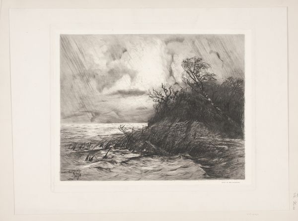 Curator: Immediately I'm struck by the turbulent, brooding quality. It's quite dramatic, almost threatening. Editor: Yes, it certainly captures a moment of elemental intensity. This is "Zeegezicht", or "Seascape", created in 1879 by Johannes Hilverdink. It’s a drawing executed in pencil, currently residing here at the Rijksmuseum. Curator: The tonality, the monochrome palette… It creates such a potent atmosphere. The composition really funnels your eye through the roiling waves towards that distant, almost spectral ship. Semiotically, it functions as a marker of vulnerability against the vastness of nature, doesn't it? Editor: It's funny you say vulnerable. I saw the ship more as… resilient, like it's braving something massive and uncontrollable. Hilverdink wasn’t trying to document, but, I reckon, trying to reflect how it feels to be so close to the edge. Like standing on a precipice... dizzying and yet magnetic. The detail he gets with simple pencil strokes is astounding—it reminds me of being seasick, but in a good way! Curator: The formal rigor in the rendering of those waves, though—look at how he's suggested form and volume purely through gradations of light and shadow. It echoes techniques used by Romantic landscape painters while incorporating nascent Realist aesthetics through a deliberate depiction of transient phenomena. It attempts a synthesis, yes? Editor: Perhaps. Or maybe he was just really moved. Maybe he had just gotten dumped or found his cat dead. Ever notice that romanticism sometimes just smells like melodrama, prettied up with technique and presented to us in tasteful sepia? Curator: Well, setting aside, for the moment, the intentional fallacy... the high horizon line combined with that shadowed sky... creates a very closed-in feeling... an impression of immense scale. Editor: Precisely. The image really sings when you think about it, and I agree; maybe that distant vessel stands for all our plucky endeavors, pitching themselves against the endless abyss of being… it feels profound and sad. Curator: An interesting point. And I, too, appreciate how Hilverdink encapsulates such powerful emotions through a relatively constrained set of graphic means.