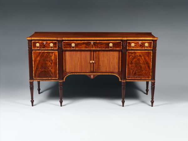 Curator: Editor: Standing before us is a mahogany Sideboard, dating back to somewhere between 1790 and 1815. Its elegant curve and the delicate inlay work are captivating. Given its presence here at the Art Institute of Chicago, I wonder about its cultural origins. What details can you share? Curator: Notice first the mahogany: its sourcing would be tightly coupled to colonial trade routes of that era. This wasn't simply a piece of furniture; it's a statement about power, consumption, and access to resources extracted from distant lands. Look at the joinery – a craft involving specialized knowledge and labour. Editor: So, the value lies not just in its function but also in understanding its historical making process. Curator: Precisely! Every detail, from the brass pulls to the veneer, involves processes deeply entwined with social and economic conditions. What does the uniformity of the design suggest to you? Was this piece made bespoke, or for broader consumption? Editor: I'm starting to consider how mass production might’ve influenced these later examples… like the hardware. Curator: And don't forget the cultural value we place on objects. How do they communicate status and values that reflect the dominant ideology? How has the role of the artist or craftsperson evolved with changes in material production? Editor: It’s like deconstructing this beautiful object into raw materials, labor, and even colonial history. I’ve never thought of furniture quite this way before! Curator: Exactly. That’s the beginning of a Materialist perspective. It allows us to look at art and artifacts not just as objects of beauty, but as embodiments of socio-economic forces. Editor: Thank you, I will keep a keen eye on all of those things.