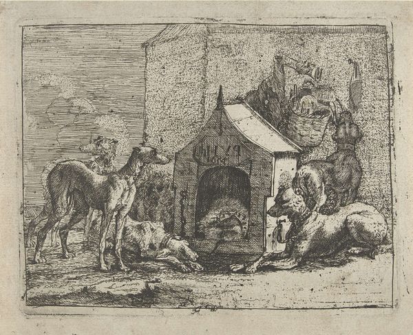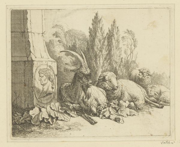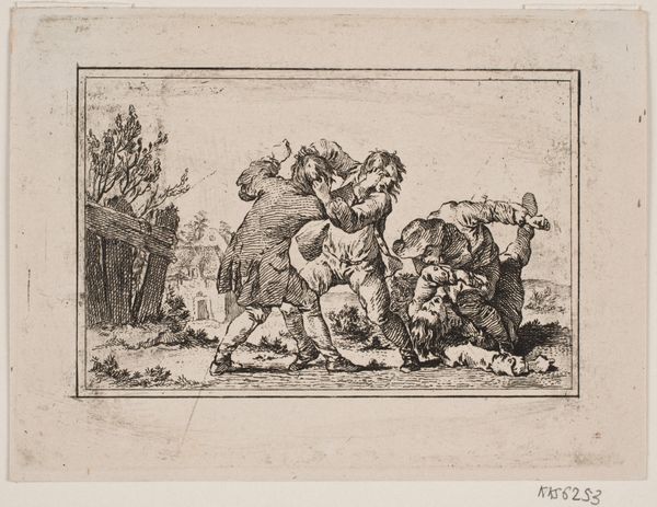Balthasar Anton Dunker created this print, "Drie mannen vangen drie schapen," sometime in the late 18th century. Dunker, working in an era defined by the Enlightenment, offers us a pastoral scene that subtly questions the era's ideals. The image presents three men in the act of capturing three sheep, yet there's an undeniable awkwardness to their movements. The men seem more clumsy than capable. Dunker subtly critiques the conventional artistic representations of rural life which often idealized the simplicity and virtue of country folk. What does it mean to depict labor this way? Is it a commentary on class, a reflection of the social hierarchy where the laboring class was often viewed with a mix of disdain and amusement by the elite? The emotional tone is muted, almost detached, inviting us to contemplate the relationship between the figures and their task. Through this etching, Dunker invites us to consider the complexities of labor, class, and representation in a changing world.