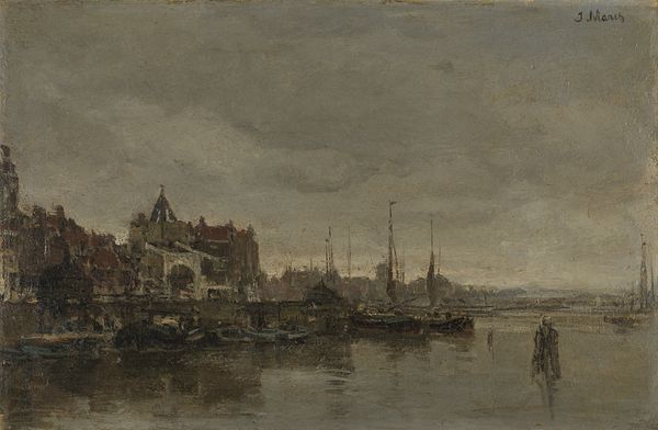 Editor: So, we’re looking at "City Wall with Gunpowder Magazine" by Carel Jacobus Behr, dating to 1830. It’s an oil painting, and I’m struck by the way the decaying architecture dominates the landscape. What social context do you see at play here? Curator: It's fascinating how Behr positions this military structure. By the 1830s, many city walls had lost their original defensive function, becoming picturesque relics or even hindrances to urban development. Is Behr romanticizing a bygone era of fortification, or perhaps commenting on the shifting power dynamics within the city itself? Consider the rise of a merchant class less interested in medieval defenses and more invested in open trade and expansion. Editor: That’s a great point! It’s not just a pretty picture; it’s a sign of the times. The way he’s included the everyday bustle with the boats seems to highlight that transition. Do you think the state of disrepair is important? Curator: Absolutely. The crumbling structure is evidence of its obsolescence, reflecting a society moving away from a need for such fortifications. What was once a symbol of protection now becomes an artistic subject, almost a stage for the daily lives unfolding around it. Notice, too, the small figures almost dwarfed by the architecture; this speaks to the new scale of social organization in the period. Editor: I never thought about it that way. So, it’s not just a building, it's about the city's evolving identity. Thanks, I’ve definitely gained a richer perspective on Behr's work. Curator: And it reminds us how paintings provide clues about changing urban societies, it is more than architectural detail.