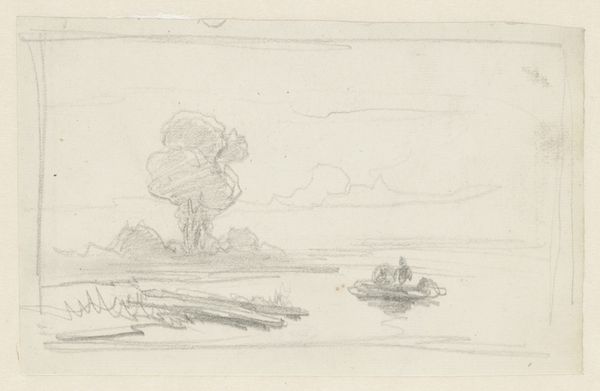 Editor: This is Andreas Schelfhout's "Landschap met huis omringd door bomen aan het water," created sometime between 1797 and 1870. It's a pencil drawing on paper, currently held at the Rijksmuseum. There's something so gentle and ethereal about the landscape, like a half-remembered dream. How do you read its composition? Curator: Indeed. Note the artist's deft handling of the pencil. Observe how the interplay of light and shadow shapes the composition and renders depth, while the restrained use of line across the toned paper allows for a striking simplicity. Consider the balance between the textures within the landscape and the figures in the boat—what relationships emerge from your formal analysis? Editor: I see the way the soft pencil work creates different textures – the smooth water, the rougher trees. It’s less about specific detail and more about the overall effect. Is the lack of detail a conscious choice by the artist? Curator: Precisely! It compels the viewer to engage with the materiality of the drawing itself. This work foregrounds the intrinsic elements, rather than offering a window onto a realistic scene. Schelfhout masterfully employs the pencil not just as a tool of representation, but also as a generator of tonal values which serve to describe volume, creating atmosphere and guiding our view towards compositional harmonies. How does this subtle variation affect the viewers perception? Editor: So it's more about the artist's process and choices than a perfect rendering of a landscape. It is interesting to focus on just how the pencil strokes add depth, but I kept expecting details I know are usually added. Curator: Precisely. It invites us to appreciate the fundamental aspects of art creation – the structure, form, and texture achieved with rudimentary means. Editor: This was quite an enlightening departure from what I typically look for in art. Curator: Agreed, sometimes simplifying the means allows us to look at a work on its own terms.