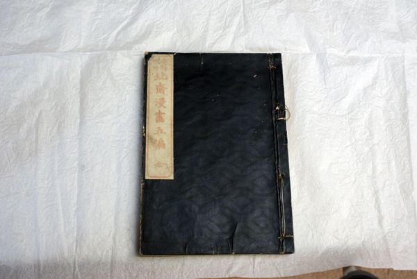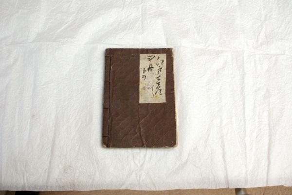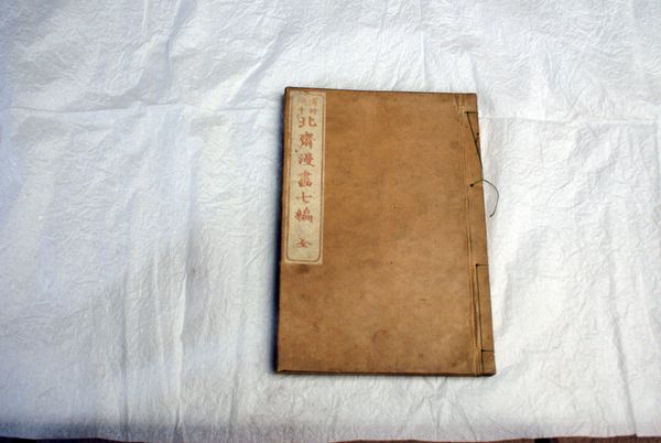 Editor: Here we have Kawanabe Kyōsai's *Kyōsai Drunken Pictures (Vol. 1)*, created in 1882, utilizing ink on paper. It strikes me as a simple, unassuming book, and I'm interested to understand how someone steeped in formalism would view it. What draws your eye in this piece? Curator: The book's materiality and composition are indeed fascinating. Notice the stark contrast between the worn, red cover and the off-white label with text. This contrast is immediately arresting and forces one to confront the physical history embedded within the object itself. Editor: That's a great point; I see what you mean about the contrast drawing the eye. The cover itself almost seems to be cracking. Is there anything about the texture or color choices that is especially notable? Curator: Precisely. The craquelure effect on the cover provides an essential tactile dimension, albeit visual. The chromatic decision to employ a saturated red alerts our senses and prepares us for dynamic imagery inside the volume. Editor: How fascinating! Looking at this now, I wonder what role condition and conservation play in how we engage with the artist's intent. Thanks for shedding light on what may seem unassuming. Curator: It's through such close, analytical viewing that we unearth profound artistic intention. Consider how these inherent characteristics inform meaning. This methodology encourages a very nuanced mode of perception and interrogation.