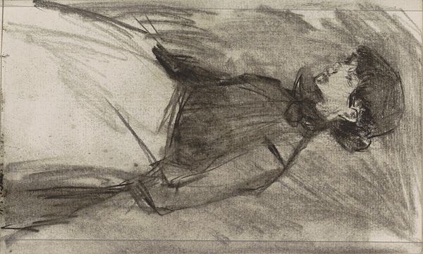 Editor: This charcoal drawing, "Vrouw," by Isaac Israels, from somewhere between 1886 and 1903, really captures my attention with its moody atmosphere. The subject's face is obscured by shadow and layered charcoal strokes. How do you interpret this work within its historical context? Curator: Well, looking at the mark-making and Israels’ association with the Dutch Impressionists, we must consider the burgeoning middle class and their desire for art that reflected their own rapidly changing world. Israels often depicted modern urban life and leisure. Does this drawing, despite its shadowy and somewhat melancholic air, perhaps capture an element of that modern Dutch experience? Perhaps a moment of quiet introspection amidst bustling city life? Editor: That's a fascinating way to think about it. I was so focused on the darkness of the drawing. The obscured face could even be a comment on the anonymity one feels in a big city! Was it common for artists to portray women this way? Curator: Indeed. Consider the increasing visibility of women in public spaces during this period. There was a cultural fascination, and sometimes anxiety, surrounding this shift. This drawing might reflect a subtle power dynamic, with the artist—and by extension, the viewer—observing a woman in a moment of vulnerability. Does the roughness of the charcoal itself suggest a certain lack of polish or idealization, moving away from traditional portrayals? Editor: That makes sense. I hadn’t considered how the *materials* themselves contributed to the message. Curator: The charcoal also fits into a broader movement away from highly finished academic paintings and towards more immediate, sketch-like works. This reflects not only artistic preference, but also the evolving art market, where smaller, more affordable works found a ready audience. So, how does that change how you interpret it now? Editor: Thinking about the market forces really clarifies it. It seems more intentional and engaged with its time than I initially realized. Curator: Precisely! Hopefully you’ll consider the interplay between art, its creators and its reception a little bit more as you go forward.