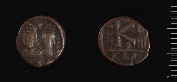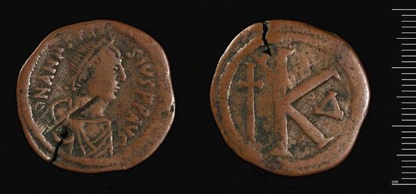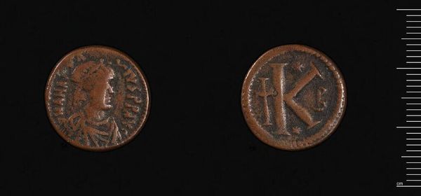Curator: This is a half follis coin of Anastasios I, from Constantinople. It weighs about 4 grams. Editor: It's amazing, isn’t it? The patina hints at centuries passed. I imagine the hands this coin has exchanged. Curator: Indeed. Anastasios I’s monetary reforms stabilized the Byzantine economy, impacting social structures by enabling fairer trade. Editor: I’m drawn to the symbolism—the emperor's profile and the prominent "K." It speaks to power, faith, and economic control, all intertwined. Curator: Precisely. Coins served as propaganda. They broadcast the emperor's image and authority throughout the Byzantine world. Editor: Looking at it through today’s lens, it’s a tangible reminder of how deeply economics and identity are connected. Curator: It's incredible to think about the ripple effect of this coin, from daily transactions to imperial power. Editor: Yes, art objects like these are portals into complex histories that still resonate today.