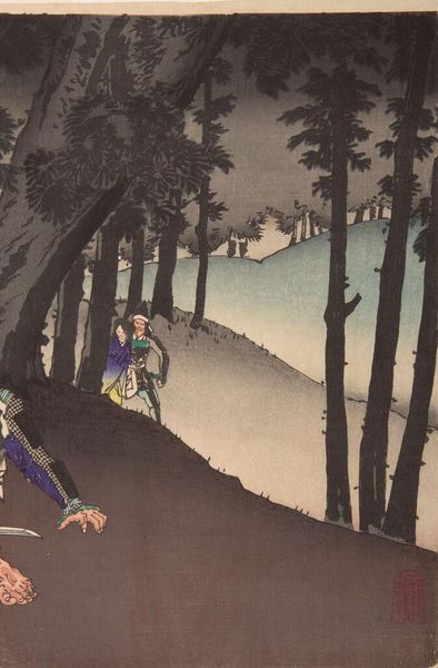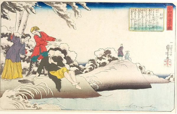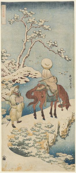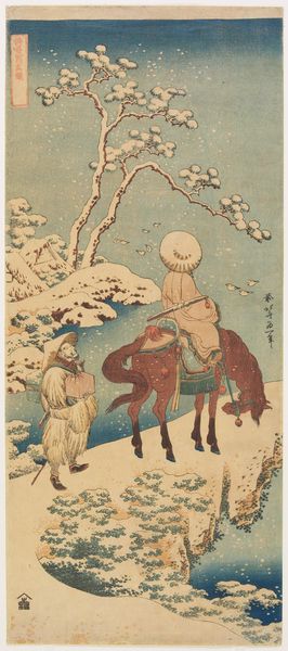 Editor: This woodblock print is called "Ikaiei fukin TÅshÅ«-fu kÅ[?] gekisen no zu" by Utagawa Kokunimasa, its date is unknown. It's quite striking, with the stark contrast of the rider against the snowy landscape. What story do you think it's trying to tell? Curator: It speaks of resilience and the struggle against oppressive forces. Consider the rider’s determined posture amidst the harsh environment. What sociopolitical messages might Kokunimasa have been conveying through the imagery of a lone figure battling the elements? Editor: So, it could be read as a commentary on the individual versus a larger power? Curator: Precisely. The image becomes a symbol of resistance and survival, echoing broader themes of social justice and individual agency. Editor: I never would have considered that. Thanks for sharing your perspective! Curator: It's about unearthing the layers of meaning embedded within the artwork. Always question, always contextualize.