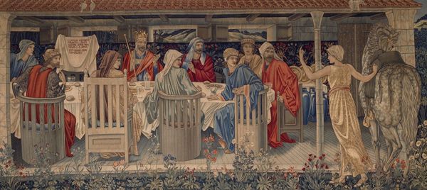 Editor: This is *The Adoration of the Magi*, a textile from 1890, designed by William Morris, now hanging at the Musée d'Orsay. I'm immediately struck by the texture, it’s so detailed! What can you tell me about it? Curator: Note how the weaving process elevates this biblical scene beyond mere decoration. We must consider the labor invested—the hours of skilled craftsmanship required to render this complex design in textile. This connects it to a broader critique of industrial production prevalent in the Arts and Crafts Movement. Editor: So you’re saying the choice of textile, rather than, say, painting, is significant? Curator: Absolutely. Think about the context. Morris championed the revival of traditional crafts against what he saw as the dehumanizing effects of mass production. This tapestry isn't just an image, it is a material assertion of value, prioritizing skilled labor and hand-made quality. Consider the availability of materials, their cost, and how this tapestry would have been consumed at the time. It's all interconnected. Does understanding the context of its production shift your view of the work? Editor: Definitely. I was focused on the Pre-Raphaelite aesthetic, but the conscious decision to create this scene in tapestry gives it a whole new layer of meaning! Curator: Precisely. It reminds us that art isn't created in a vacuum. Examining the materials and the means of production gives us vital clues to its deeper social and cultural significance. Editor: It’s like the labor itself becomes part of the narrative. That's a fascinating way to look at it. Thanks!