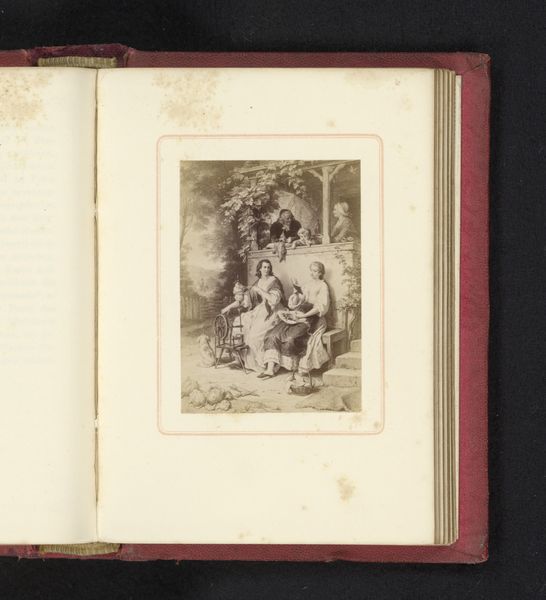 Curator: Here we have a print dating to before 1894. It's entitled "Portret van drie onbekende jonge vrouwen poserend met bloemen en een boek"—"Portrait of three unknown young women posing with flowers and a book." The photograph is credited to L\u00e9on Metzner. Editor: The figures definitely strike a melancholic chord. Three young women arranged with a quiet formalism. What is more arresting is how the symbols of their presumed innocence are subtly undermined—the flowers seem a bit too curated, the book not genuinely engrossing. Curator: It's fascinating how much that reading hinges on photographic methods and modes of consumption here. This image comes to us as a carefully reproduced print, layered with artistry from the composition and staging all the way down to the materiality and ink on the page. It certainly moves between different categories – high art and print media – through these photographic techniques. Editor: Absolutely. And thinking of flowers specifically, observe how strategically placed blooms on their hats and in their hands emphasize their connection to the natural world while simultaneously suggesting themes of fragility, transition, and mortality – a tension of youthful promise versus the ephemeral nature of beauty. Curator: Right, and these objects – the flowers and book, obviously mass produced to some degree—become part of the girls’ identities via how the photographic method immortalizes them as objects, too. The labor involved in producing such prints allows us a view of what and who could become a form of high culture at that time. Editor: Note how their poses subtly reinforce social dynamics as well – the almost supplicant figure on the lower left, seemingly withdrawn in her book. Is she a kind of symbol of female intellectualism, perhaps burdened by its own limitations within their society? The photo allows them to communicate this. Curator: And don't forget the sheer act of documenting anonymous subjects. We now recognize so many faces of various types thanks to photographs! But the fact that they're identified as ‘unknown young women’ suggests something interesting, to me, regarding consumption of the working class and leisure time afforded at that period, especially around this form of image making. Editor: Yes, this close look definitely makes us see past the surface elegance into layers of complex human meaning and unspoken desires in turn-of-the-century life. Curator: Well, it highlights that images, no matter the medium, emerge from production contexts as revealing as any symbolic gesture.
