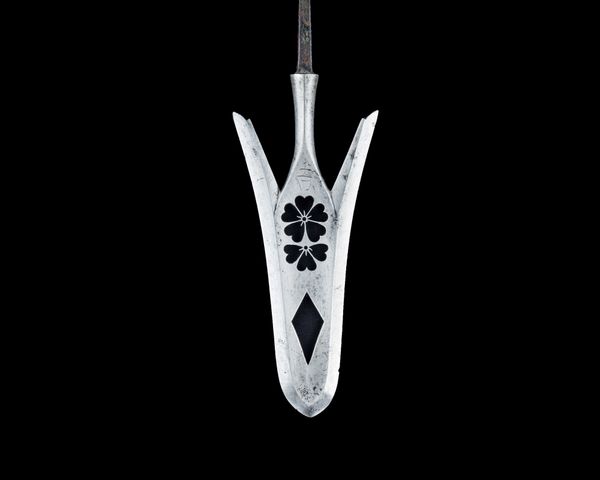 This is an arrowhead, or Yanone, crafted by Seijiro sometime in the 18th century. Note how the sleek, metallic surface of the blade contrasts with the rougher texture of the tang. This creates a visual tension between the refined and the functional. The blade itself is shaped like a shield, a subtle yet powerful gesture that implies defense as well as offense. The dark floral emblem etched into the center of the blade isn't merely decorative. Its delicate, symmetrical structure creates a focal point that arrests our gaze, yet its darker hue is also a reminder of the arrowhead's deadly purpose. Consider the interplay of light and shadow on the metallic surface. These highlights accentuate its sharp edges, essential for its function. The arrowhead invites us to consider its dual nature: an object of martial utility adorned with symbols of beauty, forcing us to question the boundaries between destruction and artistry.