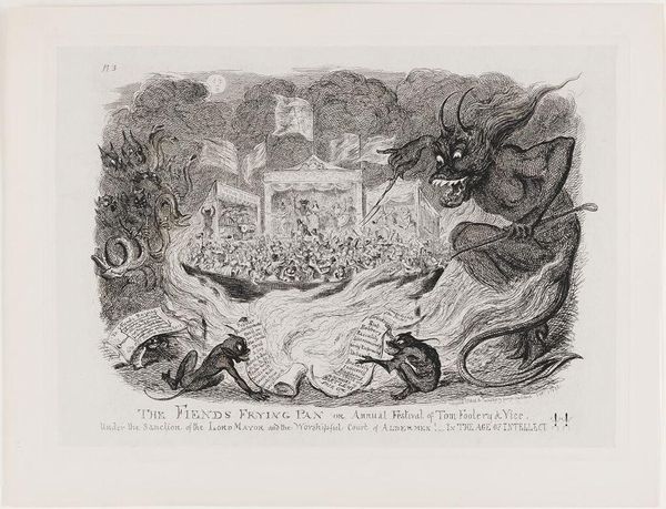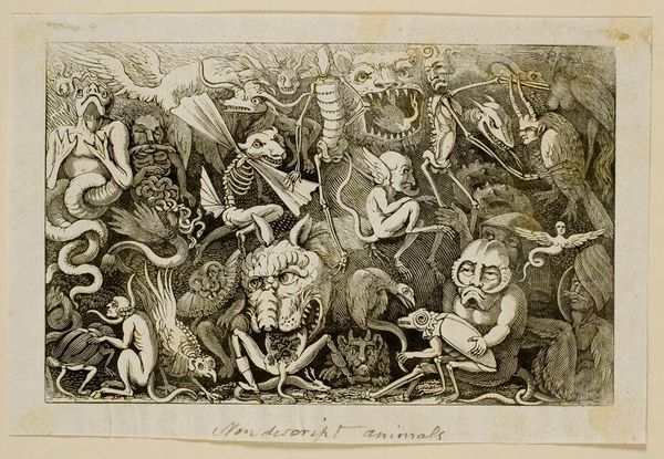 Curator: Julian Trevelyan's small etching, "Love and Friendship," from 1932, presents a fascinating, dreamlike composition. Editor: It certainly feels like peering into someone’s subconscious. The frenetic lines and cramped figures create an almost claustrophobic atmosphere. Curator: Precisely. Trevelyan employs a flurry of symbols, like those winding snakes and disembodied words, evoking themes of anxiety and perhaps the precarious nature of relationships. Notice the recurring names – Laura, Augustus... Editor: Yes, and the text itself seems to circle the figures, becoming part of the form. Semiotically, the words cease to be purely linguistic; they gain a visual weight, interacting with the figures in an almost theatrical manner. Curator: Indeed. The nonsensical phrases and proper names likely hint at personal narratives or societal anxieties of the time, coded within these symbolic characters. It's a puzzle of intersubjectivity. Editor: A rather intense little puzzle, wouldn't you agree? I find the density of the line work quite compelling; it pushes the boundaries between representation and abstraction.
