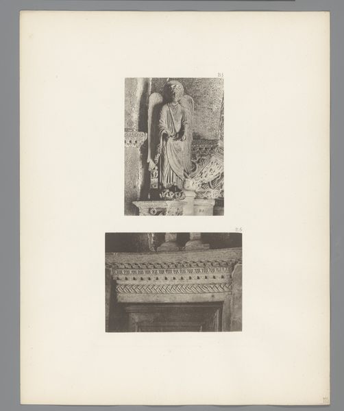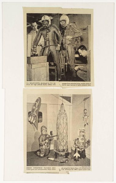 Editor: This is "Costume des chefs indiens Appiacaz (Amazone)" a mixed-media collage with photography by Gherasim Luca from 1970. The black and white tones lend an almost anthropological, documentary feel. The composition seems both deliberate and random with its superimposed images. What are your initial thoughts on the composition? Curator: Indeed, the stark juxtaposition of elements strikes a chord. Note how the photographic portrait is framed by collage elements. The composition relies on contrasting textures and tones. Observe the textures present within this piece: shiny photographic emulsion, course weave of a backdrop and the cut-out shapes layered around the central image. How do these elements interact, and what effect do they create? Editor: I see. So, it's less about the subject, but how these layers function together in one frame? Curator: Precisely. The photograph of an indigenous figure assumes a dual identity as subject matter and an aesthetic choice contributing to the artwork's overall impact. Consider how the placement of seemingly random motifs impacts your reading of the central image. Do they amplify, distract, or re-contextualize it? Editor: It does feel…disorienting. There's no real vanishing point. My eye jumps all over. So what does it all mean if it even means anything? Curator: The inherent meaning of individual components recedes behind a deliberate fragmentation to expose structure. Consider what statements about photographic integrity this work is making. The image operates according to the inherent logic of collage where context, proximity, and placement are compositional determinants. What’s your understanding of the intent, now? Editor: This wasn't meant to portray that chief; Luca used him as raw material in his structural composition. Thanks; I learned something! Curator: As did I! Thank you!