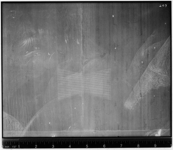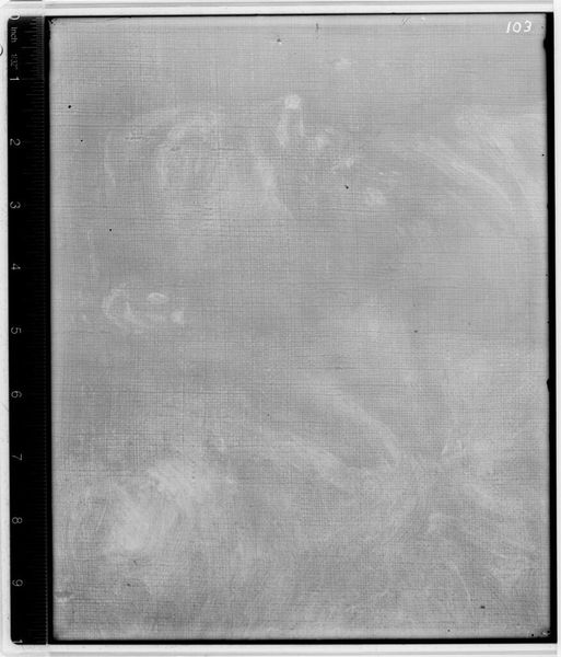 Curator: This is an X-radiograph of “Deposition,” originally by Petrus Christus, currently residing at the Harvard Art Museums. Editor: It feels ghostly, ethereal almost, like glimpsing the painting's soul. The composition is obscured, but the figures seem to be suspended. Curator: Precisely, the X-ray reveals Christus’s working method. It exposes the layers of paint application, the build-up and alterations, and the very material underpinnings of the artwork. Editor: I see the shroud very clearly; it’s a powerful, enduring symbol of mourning. Even in this spectral form, the emotional weight of the deposition is palpable. Curator: The unseen labor involved, the careful layering, tells us about workshop practices. This radiographic view dismantles any romantic notion of effortless genius. Editor: It's fascinating to see how an established image is transformed when viewed through the lens of a very different technology, the X-ray, which unearths these buried symbols. Curator: Indeed. This X-ray opens up new dimensions of understanding. Editor: It gives the whole event a contemporary resonance, almost as if it’s been re-staged for a modern audience.