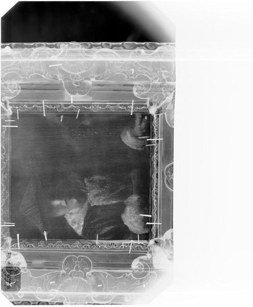Editor: So, this gelatin silver print, "Untitled (baby wearing dress posed on floral couch next to table with framed photograph)," by Martin Schweig, has such a strange, dreamlike quality. What do you see in this piece? Curator: It is eerie, isn't it? I see a play with inversions. Light and dark are flipped, and childhood innocence is recast as something unsettling. Is that a portrait of a stern-looking woman lurking in the background? Editor: It is! It adds another layer of complexity to the image. I almost feel like I'm looking at a memory. Curator: Precisely! It’s a fascinating study of memory, photography, and the uncanny valley. Makes you think, doesn't it? Editor: Definitely. I will never look at a baby doll the same way again.