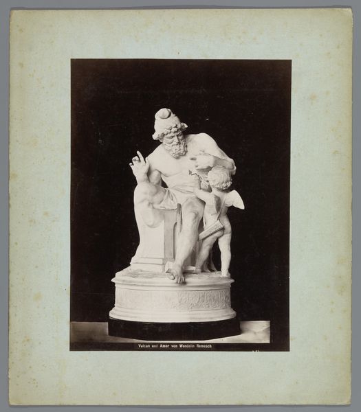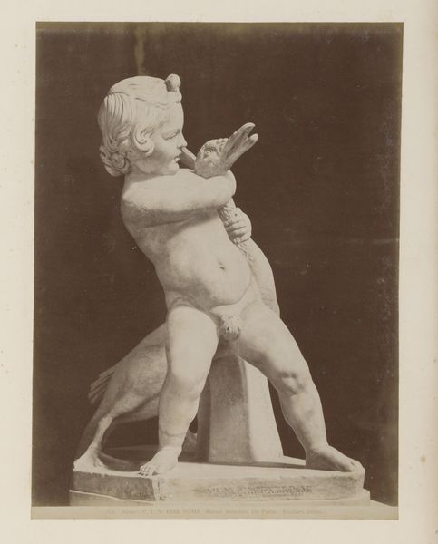 Editor: Here we have "Sculptuur van een jongen met gans, Glyptothek München," a bronze sculpture of a boy embracing a goose, dating from 1863-1890. I’m struck by the sweetness of the interaction; it's an intimate, almost vulnerable pose. What do you see in this piece, looking at it through a historical lens? Curator: It's interesting you say that. This sculpture exists within a long tradition of Neoclassical art, referencing idealized forms from Greek and Roman antiquity. However, by depicting a child with an animal, it subtly departs from the grand narratives typical of earlier Classical works. It invites us to consider the changing role of art during the mid-19th century. Who do you think might have been the intended audience for such a work? Editor: Hmm, probably the growing middle class, looking for art that was relatable rather than purely aspirational. Curator: Exactly! This period saw an increasing desire for domestic, sentimental art. By bringing this more intimate, "realistic" classical sculptures, sculptors like the unknown artist, could market it to individual taste. How might the presence of this sculpture in the Rijksmuseum, a public institution, shape our understanding of it today? Editor: Placing it in the Rijksmuseum elevates its status, gives it an official cultural endorsement, if you will. It's not just sentimental decoration anymore. It makes us see it as worthy of study, consideration of larger historical forces... Curator: Precisely. And this elevation contributes to shaping artistic canons and influences what we value and remember. I think that considering context really shifts my first sweet impression of this artwork to that of larger implications of cultural appropriation and recontextualizing artistic works across time. Editor: I hadn't thought about that. Seeing how social and cultural factors changed the sculpture's perception really illuminates its value.