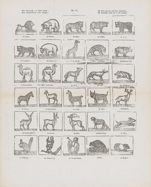 Curator: This print, dating from between 1819 and 1840 and titled "Kunt g'in deez' prent genoegen smaken, / Zoo zal m'er u nog meerder maken", strikes me as fascinating. What a menagerie of creatures! Editor: Yes, it's teeming with them! What grabs me is the grid-like arrangement – almost like a bestiary meets a very early form of a comic strip. How do you approach this type of work, especially considering its materials – drawing and engraving? Curator: Well, its medium screams "production". Engraving and printmaking, in general, allowed for widespread distribution. These images weren't necessarily destined for wealthy collectors, were they? I wonder about its audience. Did these cheap prints democratize access to images for those lower down the social scale? Editor: That's an interesting idea. You're suggesting that the print's value resides not just in its imagery, but in its accessibility? Did the production of multiple copies influence how it was seen and used? Curator: Absolutely. We must also think about who Alexander Cranendoncq was and why he made this. Is it an independent artwork, a commercial piece or, a commission? Maybe these playful depictions served a more functional role within society. Do you agree with my assessment? Editor: I do. It challenges the idea of art for art’s sake. The choice of medium here really emphasizes function, rather than the preciousness associated with unique art objects. I now find this simple engraving far more complex and relevant! Curator: Indeed! Thinking about how art is made, distributed, and consumed opens a whole new world of questions. This work highlights the intersection of artistic creation, production methods and their broader societal impact.