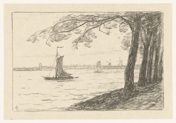 Willem Bastiaan Tholen made this drawing, Havenhoofd met schepen, using graphite on paper. The first thing we notice is its directness, a result of the artist's hand being so evident. The graphite is applied with varying pressure, creating a range of tones that suggest depth and atmosphere, from the heavy strokes defining the wooden pier, to the delicate shading of the sky. The choice of graphite is significant, a humble material capable of great subtlety, yet also associated with industrial production. In this case, the labor isn't literal but suggested through the image's subject. The boats depicted are key elements in the maritime industries of the period, representing trade, transport, and the labor of countless individuals. By emphasizing the materiality and methods of production, we can appreciate the artwork beyond its aesthetic qualities and realize the significance of its social and cultural context.