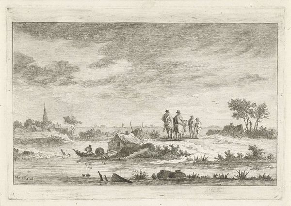 Editor: Here we have Gerrit Grasdorp's "Wintergezicht op het Zwarte Water bij Zwolle," dating from the late 17th century. It’s ink, pen and watercolor on paper. The thing that immediately grabs me is the long line of figures pulling a sled—it makes me wonder, what exactly are they hauling? What's your perspective on this scene? Curator: Well, consider the material conditions that necessitated and enabled such a scene. We have to look beyond a mere representation of winter amusement. Think about the labor involved: the ink that needed grinding, the reeds that needed processing for paper, the cost of pigments. Even the act of freezing transforming a waterway into a transport route reflects a particular engagement with the natural environment dictated by economic imperatives. Editor: That’s interesting, so you see the artwork as more than just an aesthetic representation of a winter scene, but also an indication of the material resources available at that time. But does it move beyond the immediate context in any way? Curator: Precisely. And beyond resources, it shows the availability of leisure for some. How might access to that technology, that labor, be distributed in 17th century Zwolle? Think about the production that supports even that scene. And then there's the potential commodification of this view – drawings like these would circulate, spreading certain notions of Dutch prosperity tied to this laborious, frigid landscape. Do you see anything beyond a genre painting? Editor: I suppose that hadn’t occurred to me! I was so focused on the immediate depiction of figures and landscape that I overlooked the significance of how these people are making use of what they have and how this is further commercialized as drawings of daily life in Zwolle. Curator: That interplay, the dance of labor, material, representation and consumption, is what makes it art, and more importantly makes this object more important to a cultural understanding of 17th century life and economy. It’s certainly expanded my appreciation of it, thank you!