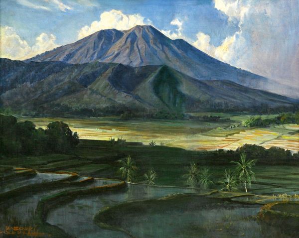 Editor: This is "Mount Aetna from Taormina," painted in 1842 by Thomas Cole, using oil on canvas. It's quite striking; that snow-capped mountain looming over what seems like ancient ruins… I’m curious about the story behind this scene. What do you see in this piece, particularly in the context of its time? Curator: Well, let's consider the art world of 1842. Cole was a central figure in the Hudson River School, a movement that emphasized landscape painting. But this isn't the Hudson River; it's Sicily. What does it mean for an American artist to depict European landscape in this romantic style? What socio-political motivations may exist? Editor: Hmm, maybe it was about creating a sense of cultural capital, a way of showing sophistication by referencing European history and scenery? Curator: Precisely. These artists often grappled with ideas of nationhood. Cole depicts a picturesque Italy, inviting American viewers to compare it with their own landscape, shaping ideas around civilization and national identity. Notice the subtle inclusion of classical ruins too? Editor: I see what you mean. Those ruins almost act as a bridge connecting the Italian landscape to classical learning and Western tradition. So, by displaying Italian scenery, the artist invites us to consider America's relationship to this narrative. Curator: Exactly! It's about participating in the historical narrative of art and asserting a place within that for the burgeoning United States. Do you notice how the light almost gives the painting a sort of theatrical or stage-lit quality? Editor: It does seem purposefully dramatic. So much brighter in the distance, near Mount Etna. Almost emphasizing a specific focal point. Curator: In art history, paintings of grandeur served the purpose of showing importance. The fact that such dramatic light rests behind Etna highlights its grandeur within this romantic context, and beckons travelers, such as Cole, and perhaps even you! Editor: Wow, I never thought about landscape painting being so intertwined with nation-building and social status! It is really interesting to see it that way. Curator: And it just shows you the important role art has always had!
