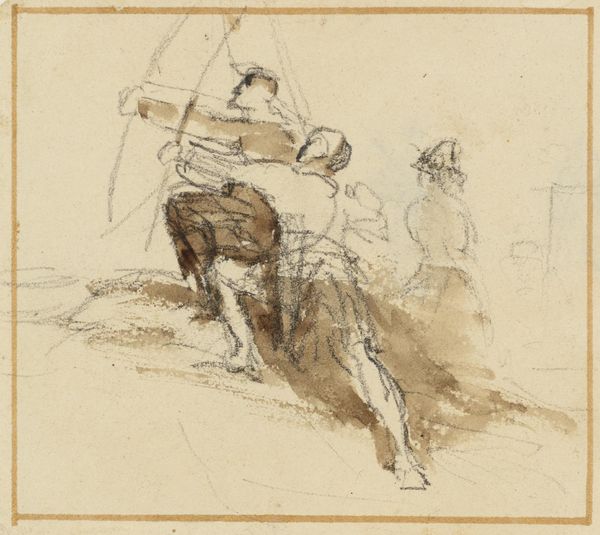 This pen and brown ink drawing by Wilhelm Marstrand captures a gondola scene, demonstrating Marstrand’s interest in form and structure through a study of line and space. The composition’s energy comes from the stark contrast between the reclining figure and the active gondolier. The reclining man, rendered with relaxed, flowing lines, is juxtaposed against the tense, angular posture of the gondolier, whose body strains against the pole. This dynamic opposition structures the entire image, creating a visual push and pull that animates the scene. The architectural backdrop is sparse. The spatial depth is compressed, focusing attention on the figures and their immediate interaction. Marstrand’s lines are not just descriptive; they construct relationships. The visual structure emphasizes a certain tension and balance, which may invite interpretations related to labor and leisure. In this way, the drawing moves beyond a simple depiction to a commentary through its structural choices. It is in this space, between representation and abstraction, that Marstrand’s drawing finds its power, continually inviting us to reinterpret its meanings.