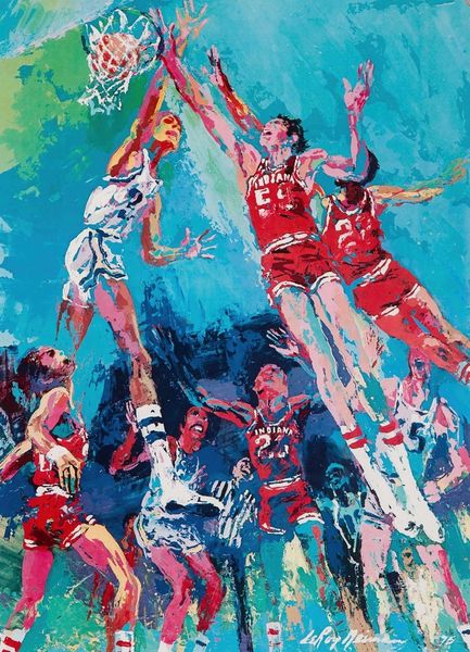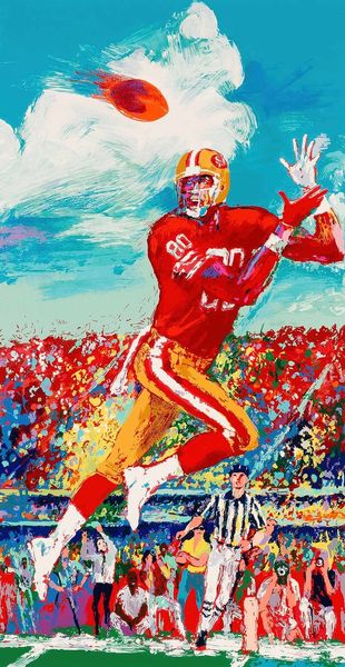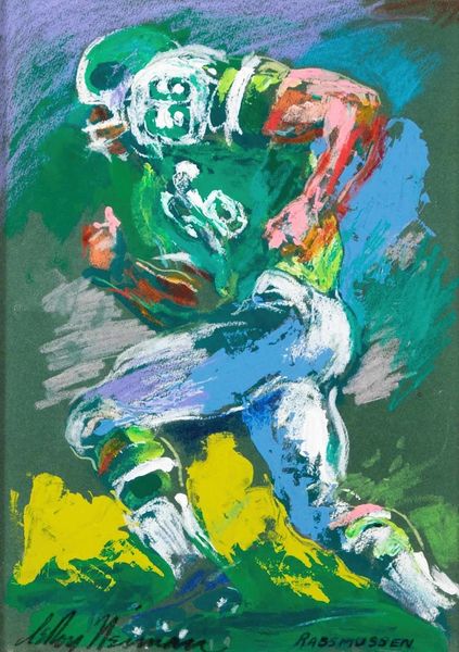 Curator: This piece practically vibrates with energy. I’m immediately drawn to the way the colors seem to leap off the canvas, conveying pure, unadulterated action. Editor: Indeed! We're looking at LeRoy Neiman’s "In the Pocket," created in 1988. He’s renowned for his energetic, almost frenetic depictions of sporting events and celebrity culture. It really reflects how he brought modernism into mass culture. Curator: The brushstrokes are so dynamic, almost like fragmented memories reassembled on the canvas. It's fascinating how Neiman manages to distill the chaotic energy of a football game into something so visually coherent, almost fauvist. Do you notice the prevalence of blue? In color psychology, blue often represents stability. Editor: Yes, there is an undeniable tension between the overall style and its cultural context. Here we have this bold, expressionist brushwork applied to…football. This was Neiman’s social role – legitimizing the spectacle of American sport through an avant-garde visual language. And notice the branded elements in the stands and scoreboard, and the team represented is clearly that of the Washington Redskins now Commanders which has had its own political issues as of late, reflecting how commercial interests shaped the spectator experience. Curator: I also can't help but see the individual narratives embedded within this broad picture of sports culture. The players, rendered with quick, expressive strokes, each seem caught in a moment of intense personal struggle, striving for a common goal yet intensely individualized within the painted narrative. Neiman’s expressionism underscores the inner dramas and psychic impact that are part of sport’s attraction. Editor: And the institutional history of how we value painting comes into question. Did the art world consider his blending of fauvist elements with advertising, popular culture, and entertainment genuine art? Was this truly democratizing art or merely high-brow commercialism? The politics of the image are still poignant, even today. Curator: That’s such an interesting challenge. To me, it echoes how cultural symbols transform, acquiring new layers of meaning and cultural memory. There is a rawness to "In the Pocket," and I sense the psychological intensity, and something fundamental in humanity seeking competition and expression. Editor: Ultimately, this work by Neiman captures a particular moment when American art opened itself up to a new, highly commercial form of public expression. It definitely has had lasting effects.