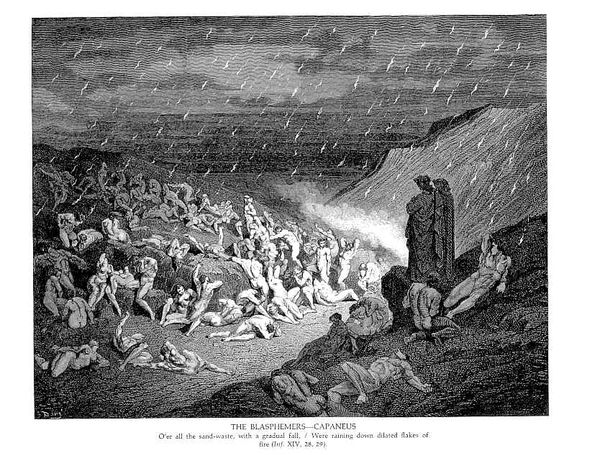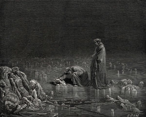 Gustave Doré made this engraving, "Traitors--Bocca Degli Abati", in the 19th century. It illustrates a scene from Dante's Inferno, where Dante and Virgil encounter the traitor Bocca in the frozen lake of Cocytus, the ninth circle of Hell. The image creates meaning through its stark contrasts and dramatic composition, evoking the torment and despair of the damned. The setting is hell, but we might also recognize the political turmoil of 19th-century Europe in this image. Dore was working during a time of massive social upheaval. The old feudal order was collapsing but new more democratic structures were emerging. Loyalty and betrayal are central themes. To fully understand Doré's work, we can consult literary sources like Dante's Inferno, historical accounts of the period, and critical analyses of Doré's artistic style and social context. The meaning of the artwork becomes clearer when we see it as deeply rooted in its specific social and institutional context.