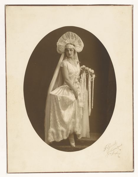 Curator: Let's turn our attention to this photograph by Pierre-Louis Pierson, titled "Judith," dating from the 1860s. It's an albumen print. Editor: It possesses such a curious theatricality. She seems both powerful and ethereal, the soft focus enhancing a romantic but strange atmosphere. Curator: Indeed. Pierson was known for his involvement with the French court. This photograph, held at the Metropolitan Museum of Art, participates in the Romantic movement’s obsession with literary and biblical heroines. Consider the details in her attire: is it bridal, or something more allegorical? Editor: I'm drawn to the careful arrangement of light and shadow, particularly on her face and the cascade of the veil. Notice the delicate balance in the tonal range. And the composition! The model seems posed against what appears to be rock formations, providing both volume and dynamism. But what did Judith symbolize at the time? Curator: Judith represented feminine power and defiance, often invoked during periods of political upheaval. Here, the photograph offers a way for audiences to reflect on gender and authority within a strict patriarchal framework. Pierson was operating in an imperial context, one bound by carefully constructed norms. How does her gaze challenge or conform to these expectations? Editor: Looking closer, one could analyze this staging from a perspective informed by performativity and theatrical gestures. Everything is purposefully manufactured: the props, the clothing, the lighting... Curator: Right, photography allowed for careful symbolic manipulations, reflecting broader socio-cultural debates on identity, desire, and representation in 19th-century France. Editor: And yet, through this photograph, we now are witnesses to a historical period, and its cultural fascinations, albeit presented through the lens of one individual. Curator: Exactly. Analyzing this work reveals not only the visual aesthetics and trends but also a snapshot of societal dialogues concerning historical tropes.