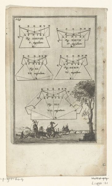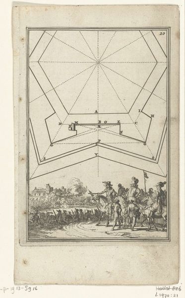 Curator: Today we’re looking at an engraving, a 1672 print by Romeyn de Hooghe titled "Illustration for 'The Labours of Mars' by Allain Manesson Mallet,” held here at the Rijksmuseum. Editor: It's wonderfully peculiar! The top half feels so precise and mathematical, but then the bottom is this chaotic skirmish, all rendered in these tiny, energetic lines. Like blueprints for a battle. Curator: Exactly! It’s part of a larger publication detailing military engineering. De Hooghe combines a precise geometric plan—showing the construction of a bastion—with an illustrative scene depicting soldiers. Note the contrast: idealized form versus the messy reality of warfare. Editor: It makes you wonder, doesn’t it? Is de Hooghe celebrating the science of war, or subtly commenting on the disconnect between theory and practice? The soldiers at the bottom seem less 'laborious' and more... miserable. Are those even tents they’re huddled behind? Curator: That tension is central to its meaning. The crisp lines and rational design of the bastion represent control, order, the application of reason to conflict. Semiotically, the lines serve as signifiers of human mastery. Editor: And yet, those lines also contain and constrict. There’s something deeply unsettling about turning human conflict into geometry. All that precise measuring and calculation...for what? More destruction. It's almost darkly comical. Curator: I find your reading compelling. It speaks to a Baroque sensibility, that contrast of clarity and chaos, the idealized and the mundane. Even the medium itself—engraving—emphasizes this dichotomy, demanding precision but allowing for expressive detail. Editor: Thinking about it now, I realize it makes you see things differently – that sometimes the rigid plans of the generals are futile against human error or the chaos of chance. In that sense, perhaps, the artist gives precedence to humankind over warfare technology. Curator: A resonant note upon which to conclude our analysis. De Hooghe presents us with more than just an illustration; he delivers a meditation on war, science, and humanity.