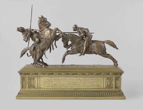 Curator: Right, let's dive into this whirlwind of myth. This sculptural work presents "Hercules Freeing Prometheus," estimated to have been crafted sometime between 1670 and 1749 by François Lespingola. Editor: My first thought? Pure theatricality. Look at that dramatic tension! The intertwined bodies, the struggle… It’s like Baroque opera frozen in bronze. It’s almost overwhelming. Curator: Absolutely. Notice the complex pyramidal composition, the dynamism, as Hercules aims his bow... Lespingola clearly sought to capture a specific, powerful narrative moment. Editor: It's a very arresting moment. The chains binding Prometheus – potent symbols of oppression – juxtaposed with the muscular heroism of Hercules. The eagle eternally preying on Prometheus’ liver is so brutal, almost lurid in its symbolism. A symbol of divine punishment, wouldn't you agree? Curator: Indeed, it represents the endless torture inflicted as retribution for Prometheus's gift of fire to humanity. It echoes not only that act of defiance, but also his gift of knowledge. It reminds me of similar imagery related to temptation and sacrifice in Judeo-Christian traditions. Editor: And there’s something viscerally human about Prometheus’ agony; a timeless symbol of suffering, resilience and defiance against the tyranny. I also love how Lespingola doesn't shy away from the almost erotic undertones – those straining muscles! Curator: It certainly invites multiple interpretations. But regardless of your perspective, it compels a recognition of struggle against authority. It mirrors societal tensions prevalent in his era. What an important perspective it gave, back then. Editor: Absolutely. To have such a bold visual statement of freedom and resistance – especially rendered so dynamically – must have been incredibly impactful. I am very glad that this image still provokes conversations.
