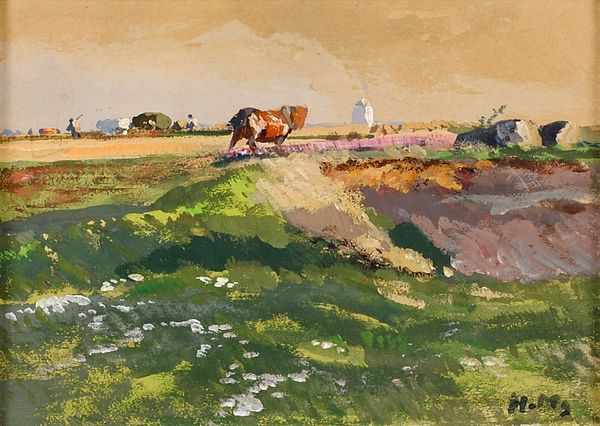 Hugo Mühlig’s small oil painting ‘Field Work’ presents a vista of rural life, where nature and labor intertwine. The foreground is a riot of green and white floral textures, leading to a freshly ploughed field dominated by rich, earthy browns. The composition is divided into distinct horizontal layers, each suggesting a different state of cultivation, with the lighter sky providing a backdrop to the activity below. Mühlig's use of colour here serves to differentiate the stages of agricultural work, creating a visual narrative of land transformation. The artist’s brushwork lends a tactile quality to the scene, as it captures the rough texture of the soil and the soft undulation of the meadow. The figures of the workers and animals are rendered with economical brushstrokes which suggests movement. Through the use of colour and texture, Mühlig highlights the symbiotic relationship between humans and their environment.
