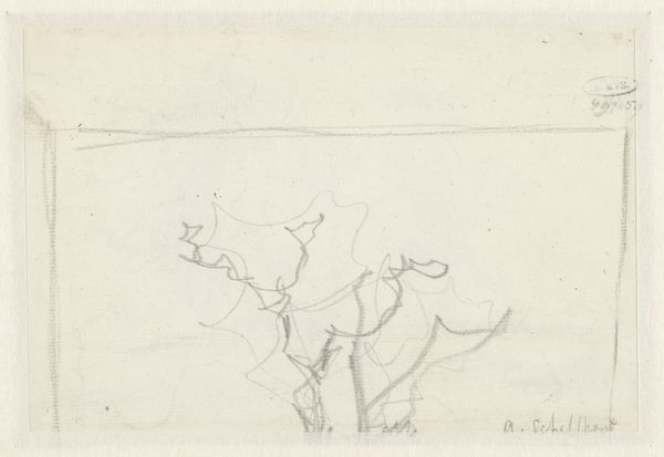 Editor: Here we have Anton Mauve's "Heuvellandschap," a landscape drawing rendered in graphite, sometime between 1848 and 1888. The monochromatic palette and sketchy lines evoke a sense of quiet desolation. What do you see in this piece? Curator: I find the composition particularly striking. Notice how the horizon line, though seemingly simple, is actually constructed through a layering of loosely defined forms. The pressure and directionality of the graphite strokes vary to build a sense of depth. It invites a careful reading of its formal relationships: the stark contrast between the dense foreground and the barely-there suggestion of a sky creates a fascinating tension. Editor: That makes sense. I was focusing on the overall image but now I see it in those layers you are mentioning. It looks almost unfinished... Curator: Precisely. One might say its “unfinished” quality reveals Mauve's process of translating observed reality into artistic form. It calls into question our very notion of finish. How does this apparent lack of completion affect your interpretation of the piece? Editor: It gives the drawing an immediacy; I see the artist's hand, the act of creation itself, perhaps more vividly. But isn’t this landscape also tinged with Romantic ideals, with the ‘sublime’? Curator: While the landscape might invoke romanticism, I'm drawn more to how it adheres to—or perhaps subtly departs from—the conventions of realism through purely formal devices, like its strategic use of line, value and shape. Editor: Interesting. I hadn’t thought of approaching it quite that way, separating form so distinctly from any possible content. Curator: A close consideration of its construction invites us to a new form of appreciation. It encourages us to ask more fundamental questions. Editor: Thanks. That helps me see the power of formal analysis.