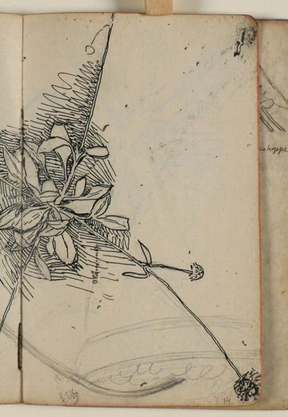 Editor: This is "Plantestudie," a plant study created by Niels Larsen Stevns between 1906 and 1910, using ink and coloured pencil on paper. It looks like a quick sketch from a personal notebook, focusing on a single plant. How do you interpret the significance of this isolated botanical study? Curator: Well, seeing a sketch like this, particularly from the Art Nouveau period, I am struck by how artists turned to nature as a wellspring of not just beauty, but meaning. Do you see how the artist emphasizes the lines and shapes? This isn’t just a plant; it's a symbol. Editor: A symbol of what, exactly? I mean, it just seems like a simple drawing. Curator: Consider the context. Art Nouveau was all about finding new forms of expression, and nature provided a language. This stylized plant, captured with such detail, can represent growth, cycles of life, even the interconnectedness of all things. It's a reflection of the artists worldview. Does the composition tell you something about it being at the centre of something larger? Editor: I guess it does, now that you point it out. The placement in the sketchbook feels almost like a sacred space for observation. Curator: Precisely. And, recall, this was also a time of burgeoning interest in psychology and the subconscious. Artists were exploring how images can trigger emotions and memories. This simple plant form could unlock a cascade of associations, rooted in cultural memory. Editor: So, it's less about the plant itself, and more about what it represents culturally and emotionally? Curator: Exactly. This small drawing contains multitudes. The way Niels Larsen Stevns chose to depict this plant invites us to reflect on our relationship with the natural world and the symbolism we project onto it. Editor: That gives me a lot to think about, viewing it as a visual encapsulation of deeper meaning rather than just a botanical study. Thank you!