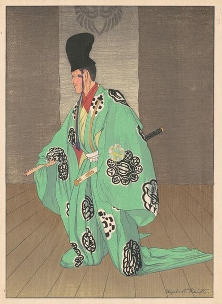 Curator: Let’s delve into Uemura Shoen's "Kinuta," created in 1938. We see a woman standing in traditional Japanese clothing. Editor: It's remarkably serene. The pastel palette and delicate rendering create a somber, almost melancholic atmosphere. Curator: That somberness could reflect the socio-political context of 1930s Japan. Shoen often explored the inner lives of women constrained by societal expectations, a subtle critique embedded in her art. The materials themselves are indicative of a careful hand – thin washes of watercolor create such subtle depth. Editor: Yes, it makes me think of the labor involved in producing the pigment. Looking at the surface, there's such dedication. Are the figures represented related to laborers as well, with their practices, tools and modes of fabrication of something we should understand. I agree about the sociopolitical, she may reflect traditional representations of womanhood within increasingly restrictive conditions, mirroring historical constraints through her carefully chosen figures. Curator: Indeed. Shoen, as a female artist in a male-dominated art world, would have keenly understood those constraints. The delicate washes of watercolor, her preferred medium, might even symbolize the fragile position of women at that time. Even how she depicts her face—there's a particular kind of labor in performing a stoic identity like this, you can notice the downcast eyes and stillness in posture, reinforcing a culturally constructed ideal. Editor: It's interesting that you mention the use of watercolor. Considering Shoen's stature as one of the leading painters in the *bijin-ga* style, focusing on beautiful women, one can see the labour behind achieving this simplicity, and that this style, like other types of cultural product, can be disseminated at large scale within society. And she managed this using craft processes. I wonder if it gave her independence too. Curator: Her paintings granted visibility, to her female sitters and to herself as a professional woman and maker in an age when most women in her class could only imagine their value within domestic sphere. Editor: Absolutely. “Kinuta" is beautiful. It allows us to connect how beauty has been materialized over time as a concept but is ultimately always related to material contexts of production, in both image and pigments.