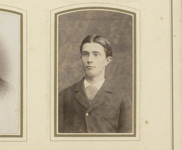 Editor: This is a portrait, taken sometime between 1863 and 1900, of a man with a walking stick, standing near a chair, credited to Johan Christiaan Reesinck, and made using photography and pencil. The formality of the portrait strikes me, it feels very staged and deliberate. How do you see the composition influencing our perception of this person? Curator: The composition is indeed quite deliberate. The figure's placement within the rectangular frame, almost perfectly centered, lends itself to a sense of order. The muted tonality—ranging from the deeper grays of his suit to the softer whites of his shirt collar—creates a subtle harmony. Observe the interplay between the verticality of his posture and the implied horizontal line of the chair. Where does that lead you? Editor: I guess the strong vertical line gives him an air of confidence and poise, whereas the subtle hint of the chair softens the whole picture. What's your take on the visual elements within the picture frame versus the blank surrounding space? Curator: The contained image space focuses our attention solely on the sitter, absent distractions. It compels us to analyze his form and presence more acutely. The unadorned background eliminates potential narratives beyond the figure itself, leaving the interpretation firmly within the realm of pure visual assessment. How does this starkness, in your view, serve the purpose of portraiture? Editor: Perhaps the simple space forces you to study him harder without other reference points. Thank you, I am going to keep this in mind! Curator: Indeed, it's the careful interplay of form and void that creates the enduring fascination with this work. Considering this piece encourages contemplation of portraiture’s essence and how that gets its effects.