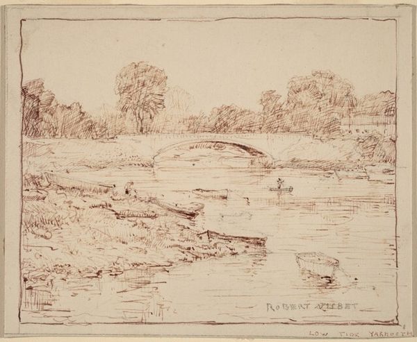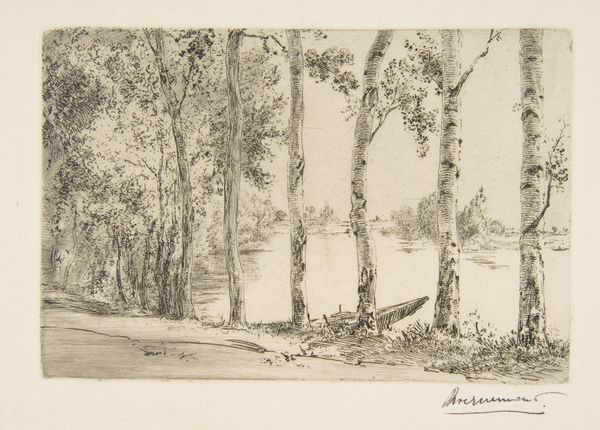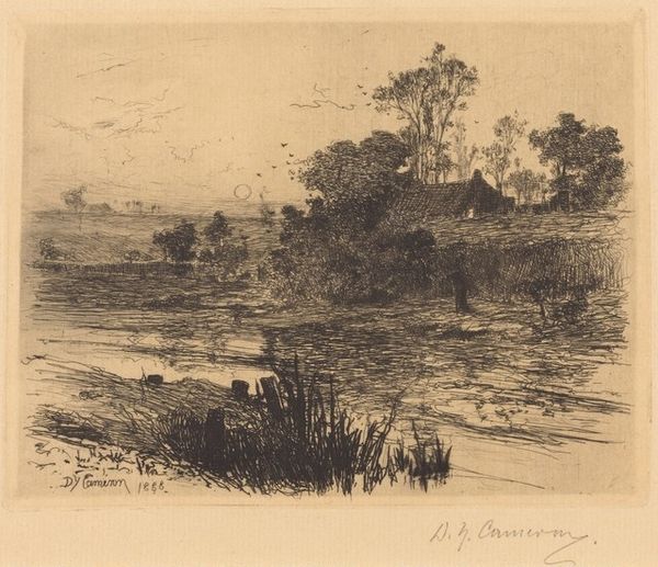 Editor: This is "Speyside," an etching by David Young Cameron, from 1888. The scene feels quiet, almost dreamlike, and I am intrigued by the boat in the middle distance; it appears to be nearly subsumed by its environment. What connections do you draw from this artwork? Curator: It is so easy to become ensnared in nostalgia when looking at a piece like this. It speaks to the complex relationship between the Scottish landscape, identity, and the industrial revolution that was then transforming labor practices. Think about it: the etching presents this ostensibly untouched vista. Yet, by the late 19th century, the Highlands had been subject to enormous social change due to land clearances that displaced tenant farmers from their ancestral lands to create large estates for sheep farming or deer hunting. In a world marked by progress and urbanization, did artworks like these evoke not just natural beauty, but an idyllic past irrevocably slipping away for those displaced and disenfranchised? Editor: That's fascinating. It completely reframes how I see that little boat; it is now not simply present but possibly emblematic of human movement and social change. Is the choice of the etching medium significant? Curator: Absolutely. Etching lends itself to detailed line work, mimicking the detail present in nature itself, while the tonal variations allow for expressive atmosphere. Moreover, prints circulate easily and therefore render images widely accessible. Consider who comprised the audience of prints at this time, and what that implied for the relationship between those individuals and ideas concerning both access to, and control of, natural resources. To whom do scenes of 'Speyside' truly belong, then? Does that differ from who might have actually seen and interacted with this print at the time? Editor: Thank you. It's like you’ve revealed a whole new dimension. It is more than just a pretty picture. Curator: Precisely. Art encourages critical engagement, asking us to explore not just what is depicted but the web of power and perspective surrounding its creation and reception.