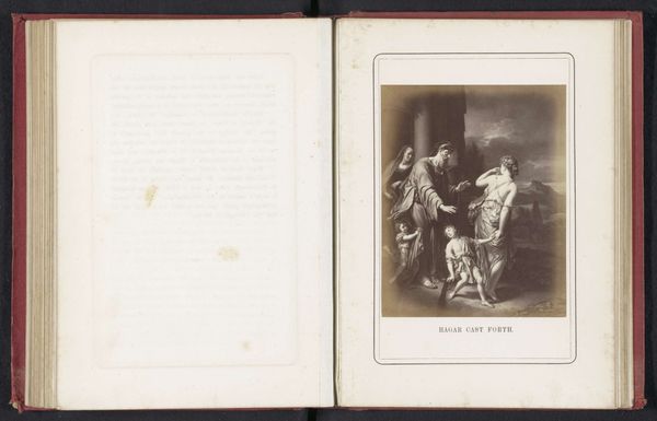 Curator: This striking image before us is a photographic reproduction of a painting of the Virgin Mary and Child, likely by Hanns Hanfstaengl, and dating from before 1864. It exists within a print form, housed within an album. Editor: Immediately, the reproduction's monochrome tones create a somber mood. I’m drawn to the central figure, of course, but the encircling individuals evoke a claustrophobic atmosphere—a real sense of historical positioning. Curator: The interesting thing here is the transition from the original painted medium to photographic reproduction. Think about the materials involved: the chemicals, the photographic paper, the printing process itself. What does it mean to translate such a historically loaded image through a relatively new industrial medium? Editor: It underscores, I think, the changing relationship between art, technology, and audience. Consider how photography democratized access to images once reserved for the elite. But beyond mere access, it shifts power, offering opportunities for appropriation and re-interpretation by varied social groups. The virgin mother becomes reproducible, a symbolic gesture considering the changing familial structures within Europe. Curator: Absolutely. We also need to acknowledge Hanfstaengl’s position. He’s not just reproducing art; he’s participating in an emerging industry—a system of artistic reproduction that has profound consequences for artists’ labor. The role of the photographer here is as a technician and disseminator, embedded in a specific set of capitalist production methods. Editor: True. Furthermore, seeing Mary replicated for potential consumption sparks necessary feminist discourse about the representation of motherhood itself, a vital concept from theological art which served to encourage gendered and racial roles. By extension, one cannot ignore how notions of gender and class intertwine during this era. Who exactly had access to this reproduction, and for what ideological ends? Curator: So, through examining the material history of this photographic print—the processes involved in its making, and the social and economic context surrounding it—we uncover a broader network of power and representation. Editor: Right, stepping back, this reproduction embodies a nexus of socio-cultural narratives. Its monochromatic depiction and replicable form challenge our assumptions around notions of originality, questioning authorship itself in our modern, ever-changing world.