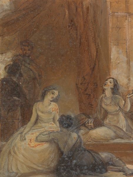Editor: This is William Blake's "An Allegory of the Bible," a watercolor in the Tate collection. It evokes a sense of ascending, perhaps towards enlightenment. What do you see in its structure, its composition? Curator: The composition is divided into distinct registers, a vertical arrangement emphasizing hierarchical relationships. Note the checkered floor, its sharp geometry contrasting with the flowing robes. Observe how lines converge, guiding the eye towards the central book form. Editor: So the book is the focal point, not the figures? Curator: The figures function as visual vectors, their gestures and positions directing our gaze. The book, rendered almost immaterial, suggests a transcendental object. What do you make of the muted palette, the delicate washes? Editor: I see a contrast between the earthly plane and the spiritual one, delineated by color and form. Thank you, that was enlightening. Curator: Indeed. The interplay of form and void reveals the essence of Blake's vision.