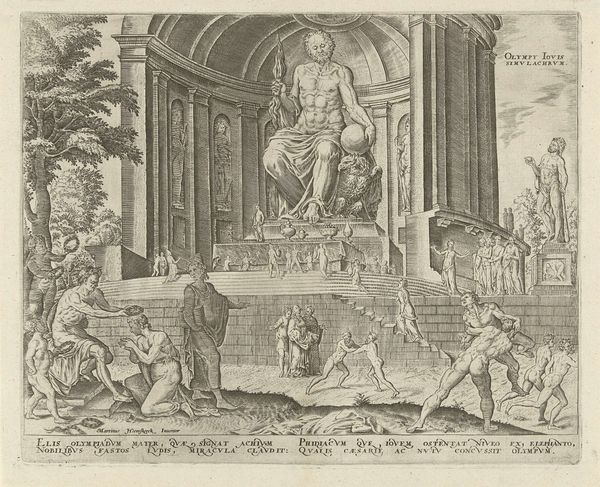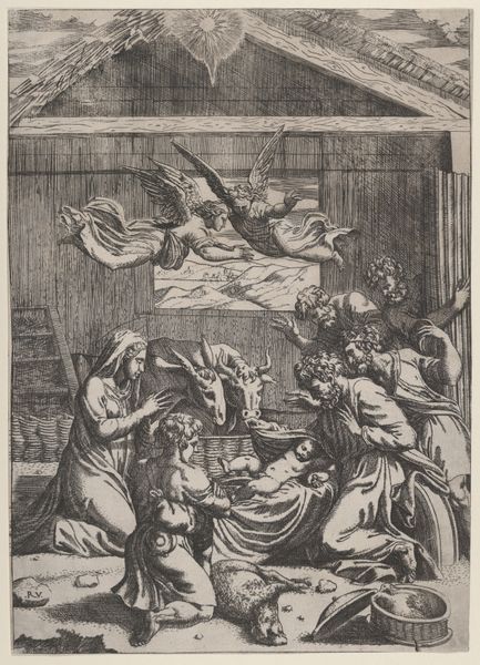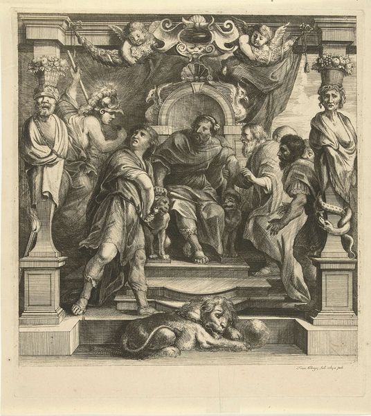 This is Battista Angolo del Moro’s “Martyrdom of Saint Justina of Antioch”, made around the mid-16th century. This print presents a complex interplay of lines that define form and space. Note how the composition is structured around a central platform, visually dividing the earthly and divine realms. The scene is rendered with detailed linear work, creating depth and texture through hatching and cross-hatching. Observe how this technique models the figures and their garments, providing a sense of volume despite the monochromatic palette. The architecture and the natural elements – the tree and clouds – frame the central action, enhancing the dramatic tension. Del Moro employs a semiotic system where gestures and expressions convey complex emotions and moral positions. The angel descending with a wreath symbolizes divine intervention and validation of Justina’s faith. The visual structure reflects a broader cultural discourse on faith, sacrifice, and the power of religious conviction. The use of line and form challenges the viewer to consider the ideological underpinnings of martyrdom.