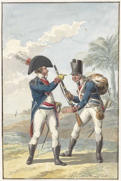 Jan Anthonie Langendijk made this print of an English guardsman and a Russian grenadier sometime around the turn of the 19th century. It reflects a moment of alliance between these two great powers against Napoleonic France. The image creates meaning through the symbolic association of national uniforms. Note the contrast between the British soldier in his practical red coat, his kit for survival strapped to his back, and the flamboyance of the Russian, with his decorative headdress. These visual codes would have spoken volumes to contemporary viewers. Made in the Netherlands, this print is an artwork that engages with the political context of its time. It reflects the cultural and political alliances that were forming against the backdrop of the Napoleonic Wars. To understand it better, one might study military history, looking at period documents, enlistment records, and, of course, other examples of popular imagery. By uncovering the historical context, we start to see the deeper meanings embedded within the artwork.
