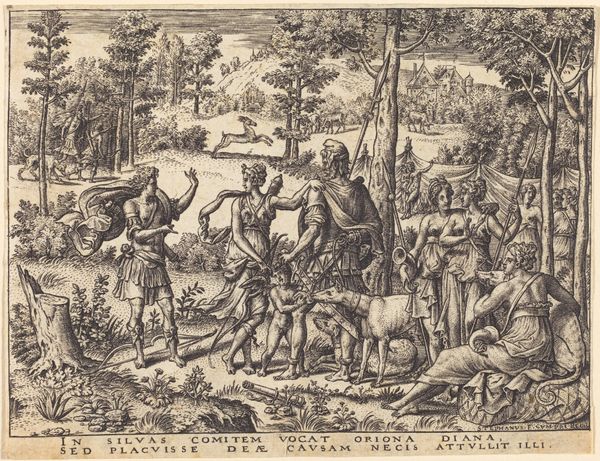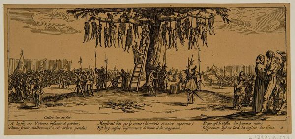Editor: Here we have Jacques Callot’s "Afstraffelse ved hœngning," an engraving from 1633. It's… quite stark. The composition draws your eye immediately to the large tree laden with hanging bodies. It feels incredibly bleak and unsettling. What strikes you about this print? Curator: The power of this image, irrespective of its historical subject, emerges from Callot's mastery of line and form. Notice the extreme detail rendered through meticulous engraving; each figure, each leaf, contributes to a rigorously constructed whole. How would you describe the spatial relationships he establishes? Editor: It feels deliberately crowded and unsettling, particularly how the execution is in the foreground and yet seemingly dwarfed by the rows of soldiers in the background. Curator: Precisely. The linear perspective pushes the viewer back, creating a disturbing detachment even as we are confronted with the graphic depictions of death. Callot seems less interested in the visceral impact of violence than with the formal orchestration of bodies in space. Consider the role of the tree, then; it operates less as a symbolic motif than as a structural anchor around which the entire composition revolves. It divides the crowds as well as displays death, right? Editor: It does. The way he balances the chaotic imagery with a rigid, almost mathematical structure is really interesting. It creates this unsettling tension, like order imposed on a horrifying scene. Curator: Yes, and this tension is critical. It forces us to engage with the work on a purely visual level, disentangled from any moral judgment of the event itself. What appears at first glance to be narrative then emerges as a sophisticated study in line, form and the orchestration of masses within a highly defined space. Editor: So, in a sense, the emotional impact, although profound, is secondary to the technical and formal choices? Curator: Indeed. Callot presents a formal problem solved with ruthless precision. This reveals the aesthetic qualities and separates the signifiers. It makes you reconsider your first reaction, I think. Editor: That's given me a completely new lens through which to consider the image. I went straight to the thematic elements, and had failed to notice the way the image is working, architecturally, I mean. Curator: Exactly! Focusing on those basic formal aspects of line, texture, structure can enrich any engagement. It helps one approach artwork with clear and novel focus.
