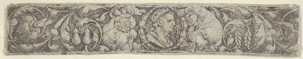 Curator: This engraving is entitled "Masker met lauwerkrans," which translates to "Mask with Laurel Wreath." It was created sometime between 1626 and 1676 by François Chauveau. Editor: It strikes me as odd—a grotesque face crowned with laurel, so I guess meant to be something between dignified and humorous? There's almost a sense of caricature about it, even with the traditional engraving style. Curator: Chauveau, a Baroque artist, often worked in the service of powerful figures. This print likely circulated within those circles, possibly as part of a series, perhaps for a theatrical production or festival celebrating a victory or a ruler. The "mask" element would point to the influence of Commedia dell’arte, or possibly aristocratic masquerades. Editor: I am drawn to the texture rendered by the engraving, it’s remarkably detailed. The fine lines and cross-hatching really define the folds of the face and the lushness of the wreath. It shows quite sophisticated technical control of the burin. The artist seems intent on making textures read three-dimensionally. Curator: Baroque imagery served as a powerful propaganda tool, often imbuing rulers and patrons with historical significance. Even this peculiar mask is crowned with laurel—a direct connection to the glory of the Caesars. There's often an interesting play in the period of embracing older images to justify current displays of power. Editor: Still, this laurel seems less heroic crown and more like decorative trimming, wouldn’t you say? It adds to the strange dissonance I’m sensing – the refined technique contrasted against the, dare I say, chubby face. Curator: That very tension might be Chauveau's aim: subverting classical ideals to comment, even if subtly, on contemporary society. These historical allusions do so much cultural work. Editor: Agreed, this small piece presents a lot of contrasts between technical prowess and physical bluntness. The wreath feels more decorative than symbolic given how the overall image has taken shape. It makes you want to keep looking, and try to imagine the artist making it!