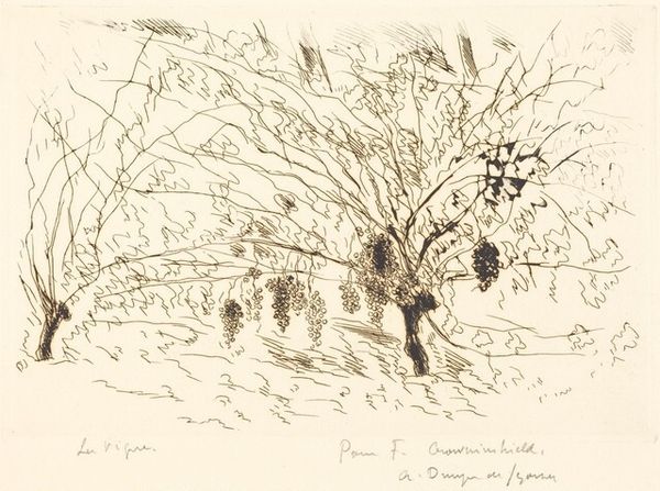 André Dunoyer de Segonzac made this etching, called "Les Grappes," sometime in the mid-20th century. Segonzac was a painter and graphic artist who worked within the traditions of Impressionism and Post-Impressionism in France. Here, we see a seemingly simple scene: a vine laden with grapes. But consider the cultural significance of wine in France. Viticulture is deeply entwined with national identity, regional economies, and social rituals. Segonzac's choice of subject matter speaks to a celebration of rural life and traditional values. The loose, expressive lines of the etching capture the abundance of the harvest and the pleasures of the French countryside. He studied at Académie Julian, where he met Luc-Albert Moreau and the two artists remained lifelong friends. Art historians might delve into agricultural practices, wine production methods, or even literary depictions of vineyards to further enrich their understanding. We understand that, to truly appreciate a work like "Les Grappes", we need to consider the web of social and institutional contexts in which it was created and consumed.