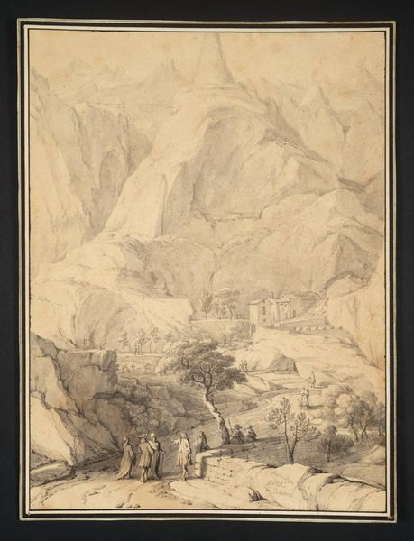 Editor: This is William Pars' watercolor, "Near the Mont St Gothard." It's quite striking how the formidable rock face dwarfs that tiny doorway. What cultural narratives might have shaped the viewers' reception of such a landscape? Curator: Indeed. The sublime landscapes were highly fashionable. Think about how wealthy British men, on Grand Tours, were expected to engage with and, crucially, document their travels. Editor: Document for whom? Curator: For themselves, as a mark of status, but also for a burgeoning market back home. Watercolors like this became easily transportable trophies, evidencing their refined tastes. This image thus plays into that performance of cultivated travel and consumption. Editor: So, it's less about the place itself and more about the act of seeing and possessing it, in a way? I hadn't considered that. Curator: Precisely. It makes you wonder about the power dynamics embedded in landscape art. Editor: Definitely gives me a new perspective. Thanks.