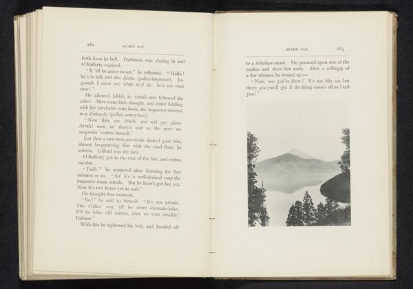 This is William Kinnimond Burton's photograph of Mount Fuji, printed in a book. The black and white image emphasizes the mountain’s stark silhouette. The composition divides the scene into distinct horizontal bands—the foreground with trees, the rolling hills, and then Fuji itself. Burton plays with tonal contrasts, from the deep shadows of the trees to the soft gradations of the mountain. The texture of the photograph gives a sense of depth and distance, creating a visual hierarchy where Mount Fuji dominates. This photograph is less about capturing a specific moment and more about constructing a symbolic landscape. The formal qualities—the stark contrasts and layered composition—evoke themes of nature, spirituality, and the sublime. The photograph invites viewers to meditate on the relationship between the earthly and the transcendent, as embodied in the iconic form of Mount Fuji.