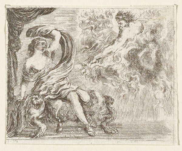 Editor: Here we have "Jupiter et Danaë," a 17th-century etching by Stefano della Bella, now hanging in the Minneapolis Institute of Art. It strikes me as quite dreamlike, almost ethereal, given the limited tonal range of the print medium. What is your take on this piece? Curator: Dreamlike is spot on. It’s that delicate dance between the mythological and the deeply personal that always grabs me. The rain of gold, for example, isn’t just a symbol of divine intervention or wealth; it's like a shower of pure imagination. The artist seems to be asking, “What if divinity wasn’t thunderous and imposing, but intimate and transformative?” Look at Danaë's expression – she’s not scared or overwhelmed, is she? Editor: No, not at all. She looks almost… accepting? Relaxed even? I suppose gold raining down on you could be a nice experience, though perhaps a bit drafty! Curator: Exactly! It's playful and serious all at once, reflecting the complexities of baroque sensibilities. The loose line work suggests movement, almost as if we are witnessing a fleeting moment from a dream. The artist has also created some intriguing, almost caricatural figures that appear quite earthly against the imagined event. What do you make of them? Editor: Good point. They're a little off, a bit exaggerated and out of sync with the reclining figure. It’s strange because those figures feel like characters out of a Breughel painting who accidentally crashed a Renaissance party. Curator: You’ve nailed it! That tension, that slight discordance is the spice, the secret ingredient! It reminds us that even grand myths live in a human context, molded by our everyday experiences, anxieties and humors. I find myself wondering about the artist’s own personal anxieties. It makes me want to know the person behind the lines, what kind of thoughts they entertained, and how this came out of the stylus. Editor: Me too! I'll definitely look at della Bella's prints with a new appreciation going forward. The piece suddenly feels like it contains so many hidden conversations.