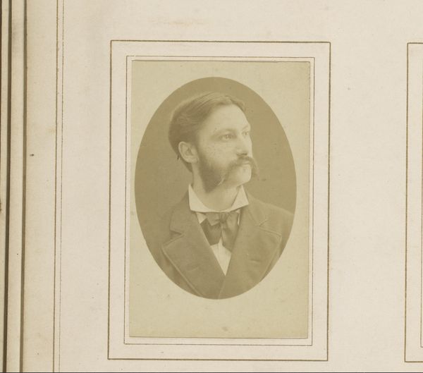 Editor: This photograph is titled "Portret van Emanuel van Beever," created between 1895 and 1905. It feels… dreamlike because of the soft focus and sepia tone. The paisley wallpaper threatens to overwhelm the sitter! What stands out to you? Curator: The visual relationships established by the artist through the organization of form are of particular interest. Consider how the sitter's rounded beard echoes the rounded shapes of the paisley. The light, its tonality and diffusion, softens edges and promotes a unification of the diverse pictorial elements. Editor: I see that connection now, between the beard and the wallpaper, it’s clever how they relate, even though they’re very different things. Is the texture intentional, to blend him with his environment? Curator: Precisely! Note too how the artist uses shallow depth of field. The foreground blurs, and attention is focused primarily on the planes of the sitter’s face, achieving both a decorative effect and a clarity of focus. Editor: So it's not about telling a story, but about how all the parts work together visually? Curator: Indeed. The brush in his hand, the painter’s palette… are they signifiers pointing beyond the photographic image itself? Or do they rather operate as additional compositional components, enriching the tapestry of textures? Is the interplay itself the subject? Editor: I suppose I usually look for the story, but I’m beginning to appreciate how the purely visual can be so powerful too. Thank you! Curator: A close study of its structure does indeed reward the patient viewer.