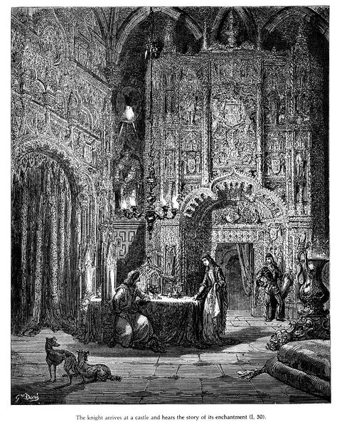 Gustave Doré made this engraving, titled "Don Quixote," during the mid-19th century. It captures a scene from Miguel de Cervantes' novel, portraying Sancho Panza recounting the enchantment of Dulcinea to the Duchess. The image is rich with details reflecting the social dynamics of the time. The Duchess and her attendants, adorned in elaborate gowns, exude aristocratic elegance, standing in stark contrast to Sancho's humble posture, kneeling before them. Doré masterfully uses light and shadow to emphasize the class divide and the theatrical nature of courtly life. The opulent interior, complete with a grand fireplace and decorative elements, underscores the wealth and privilege of the ruling class. Doré's illustrations brought Cervantes' tales to a wider audience, reinforcing the cultural values and social hierarchies of 19th-century Europe. To fully appreciate the work, one can consult historical texts and social commentaries, gaining insight into the complex interplay of literature, art, and society.